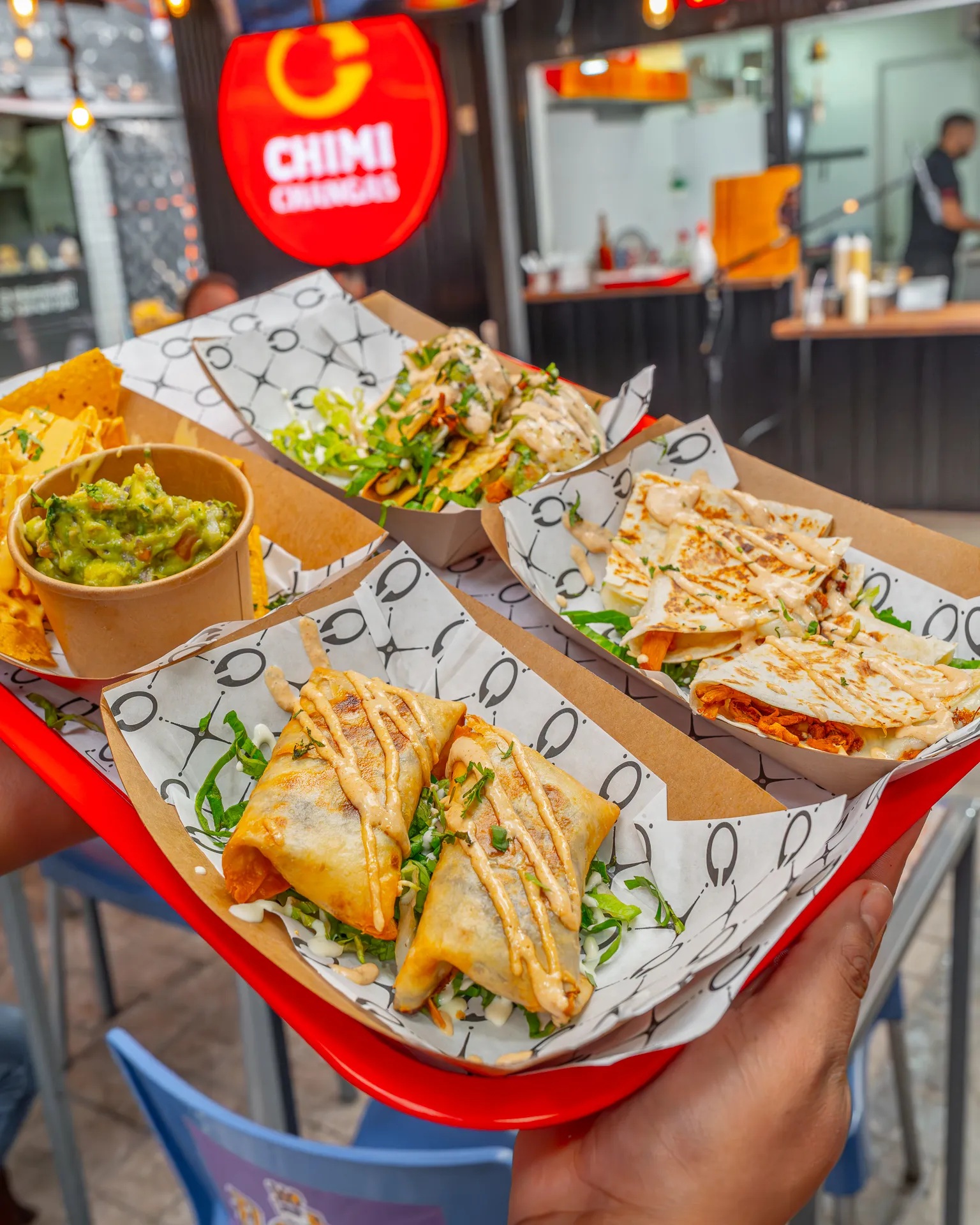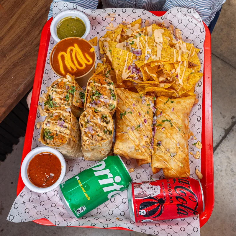 2 chimichangas, 2 burritos, chili con carne, totopos con nuestra salsa tatemada.